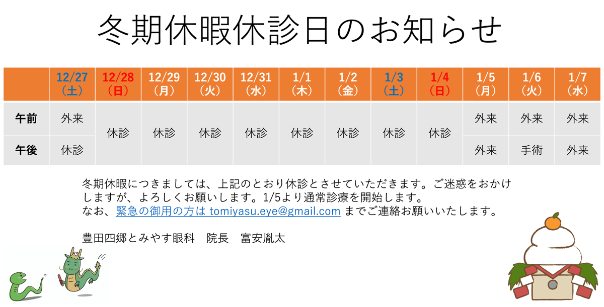 | 2025年12月27日 | 12/27(土)通常通り午前外来診療を行っております。ご予約の無い方でも受診していただけます。NEW |
