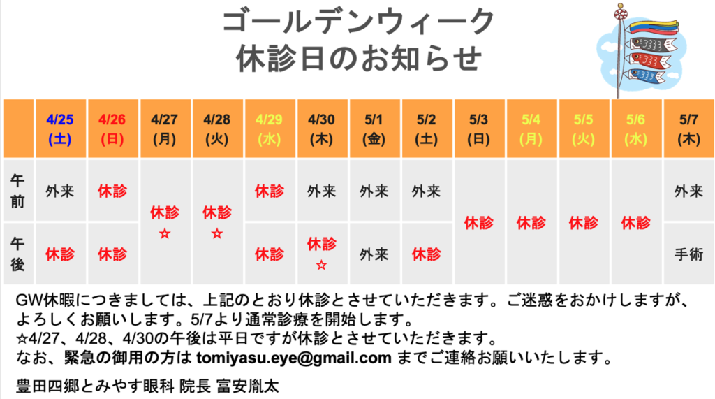 豊田四郷とみやす眼科では、一般眼科、小児眼科(ナイトレンズ)を標榜し、白内障手術、硝子体手術、など様々な日帰り手術まで幅広く診療を行っています。